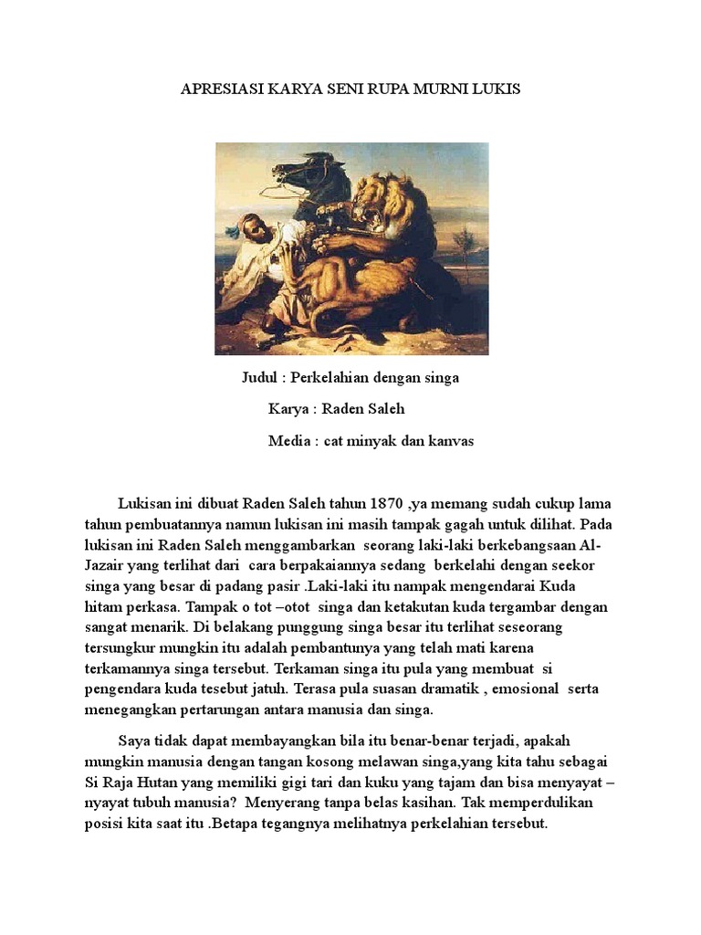 Didit Endriawan Program Studi Seni Rupa STISI Telkom email. Kalau Raden Saleh menvisulisasikan penangkapan Pangeran Diponegoro dalam lukisan Penyair Taufiq Ismail memberikan apresiasi karya tersebut lewat sebuah puisi. Apresiasi Seni Rupa.