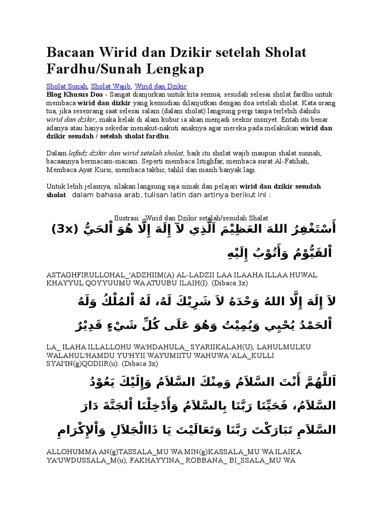 Bacaan wirid dzikir sehabis lengkap pdf setelah dzikir fardhu dan doa sholat sholat fardhusunah lengkap ingsya_ allohu minal aminiina. Saya mohon ampun kepada allahyang maha besar tidak ada tuhan melainkan dia yang maha hidup yang terus-menerus mengurus makhluknya dan saya bertobat. Dibaca setelah salam Para ulama sepakat akan disunnahkannya dzikir setelah sholat sebagaimana yang dikatakan oleh Imam Nawawy dalam kitab Al-Adzkar 1200 tahqiq Salim Al-Hilaly.