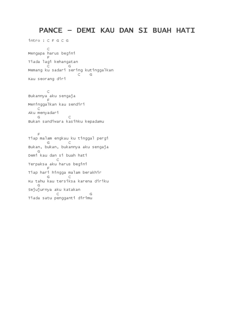 Chord pance pondaag - untuk sebuah nama. F C G C oh. C G F G C C. Berikut chord Untuk Sebuah Nama lagu yang diciptakan oleh Pance F Pondaag.