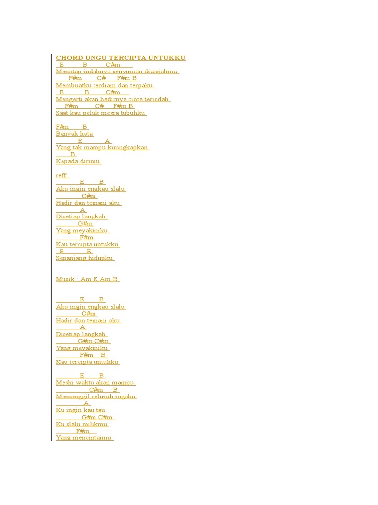 Tercipta Untukku chords by UNGU feat. Demi angan ini di saat ku sadari kau tercipta bukan lagi untukku. E B Aku ingin engkau slalu Cm Hadir dan temani aku A Disetiap langkah Gm Yang meyakiniku Fm Kau tercipta untukku B E Sepanjang hidupku INTERLUDE.